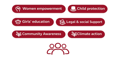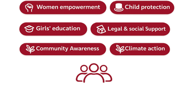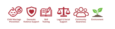Women empowerment, child protection, prevention of child marriage, girls’ education, women skill development, legal and social support to survivors, community awareness, and climate action.